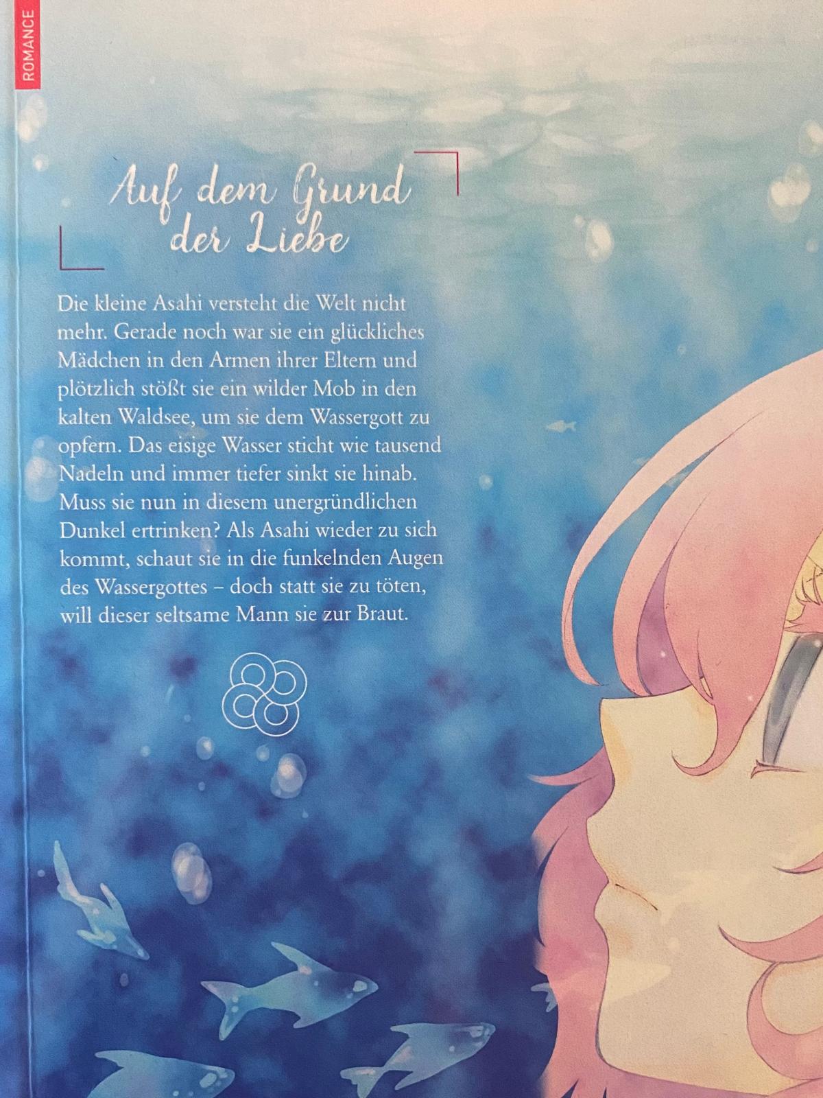 Beschreibung: Die kleine Asahi versteht die Welt nicht mehr. Gerade noch war sie ein glückliches Mädchen in den Armen ihrer Eltern und plötzlich stößt sie ein wilder Mob in den kalten Waldsee, um sie dem Wassergott zu opfern. Das eisige Wasser sticht wie tausend Nadeln und immer tiefer sinkt sie hinab. Muss sie nun in diesem unergründlichen Dunkel ertrinken? Als Asahi wieder zu sich kommt, schaut sie in die funkelnden Augen des Wassergottes – doch statt sie zu töten, will dieser seltsame Mann sie zur Braut.