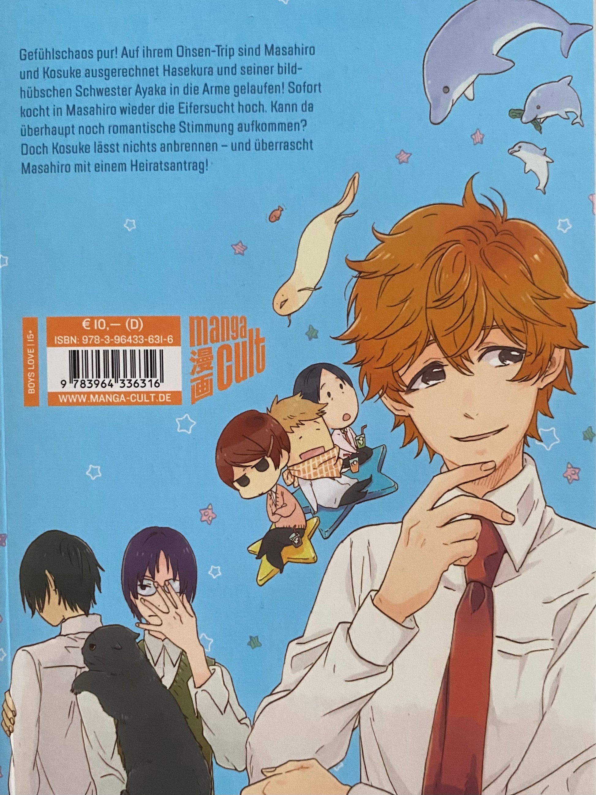 Beschreibung: Gefühlschaos pur! Auf ihrem Onsen-Trip sind Masahiro und Kosuke ausgerechnet Hasekura und seiner bildhübschen Schwester Ayaka in die Arme gelaufen! Sofort kocht in Masahiro wieder die Eifersucht hoch. Kann da überhaupt noch romantische Stimmung aufkommen? Doch Kosuke lässt nichts anbrennen – und überrascht Masahiro mit einem Heiratsantrag!